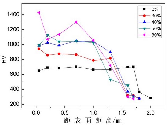 我司開發的新型復合粉末為鐵基粉末及具有超高硬度的第二相所構成,第二相最高硬度可達到HV2600-3200,因此,該硬質相的加入可大大提升熔覆層的整體硬度。同時,經過對不同比例粉末進行多次反復的試驗研究,發現復合粉末在一定比例時得到的超高耐磨合金層可同時滿足高硬度及結合面高韌性兩大優勢,整體性能最佳。對熔覆層進行微觀分析,發現其中的硬質相比例達到了70%,耐磨層的平均硬度為HRC64以上,遠遠高于基材的硬度,真正做到了內里強韌外表超耐磨。