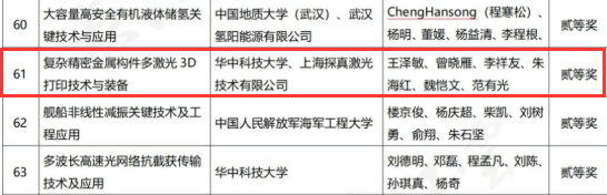 由華中科技大學、上海探真激光技術有限公司完成的“復雜精密金屬構(gòu)件多激光3D打印技術與裝備”項目榮獲技術發(fā)明獎二等獎;