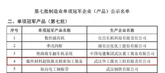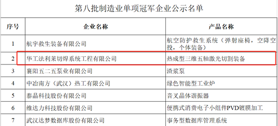 近日,工業和信息化部公示了第八批制造業單項冠軍企業遴選認定和第二批、第五批制造業單項冠軍企業名單,華工科技子公司華工法利萊熱成型三維五軸激光切割裝備榮獲“國家級制造業單項冠軍產品”稱號,目前華工科技已有三項產品獲此榮譽。
