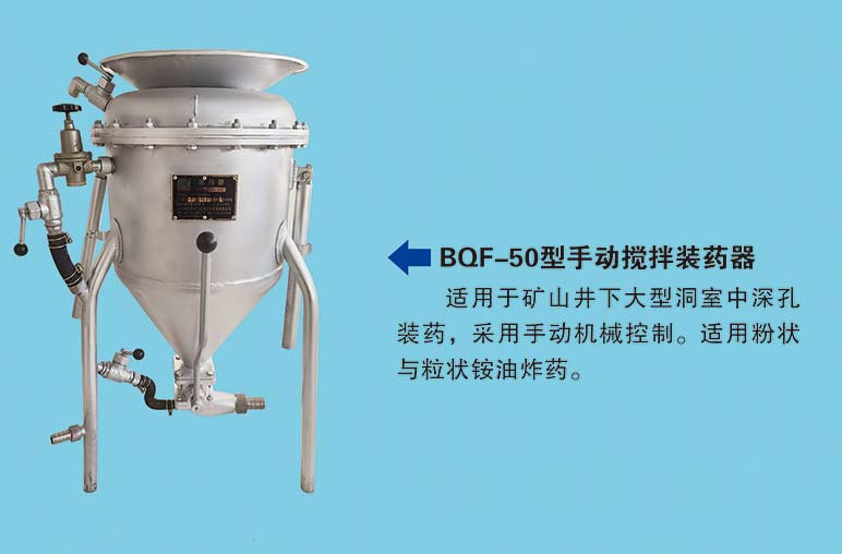 BQF-50 型抬杠式有攪拌裝藥器,適用于礦山井下大型洞室中深孔裝藥,采用手動機械控制。適用粉狀與粒狀銨 *油 *炸* 藥。
