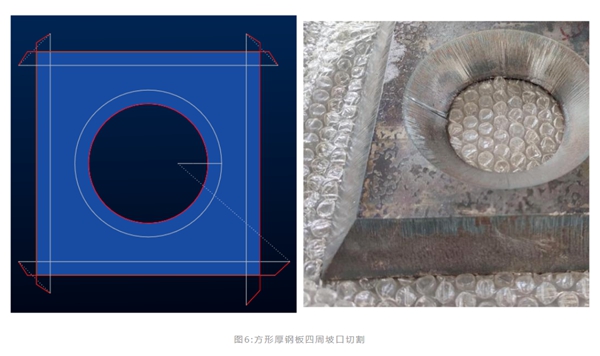 如圖6所示,正方形的4條邊都切割坡口,每條邊都是單獨打孔然后偏轉切割頭。通過修改軟件中引線參數,我們可以決定轉角過渡時引入線和引出線的長度。這種切割方式的好處是轉角處切割質量好,相鄰邊切割相互獨立,不會出現轉角燒融的現象。從切割樣件圖片可以看到,25mm鐵板四周坡口轉角處的切割質量良好,沒有出現轉角過燒現象。