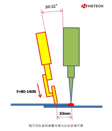 隨行壓輪系統(tǒng)裝置與激光頭的安裝角度一般為10-12°,其滾輪材質(zhì)一般為鉻鎬銅(CuCrZr)、黃銅(H65)或紫銅(T3);優(yōu)選鉻鎬銅(CuCrZr),鉻鎬銅不僅具有良好的防飛濺粘連性能,還有硬度高、耐磨的特點(diǎn)。滾輪距離熔池間距一般為10mm;若距離太近,熔池的高溫會(huì)灼蝕滾輪,影響滾輪的使用壽命;若距離太遠(yuǎn),滾輪的壓緊效果會(huì)降低,從而導(dǎo)致焊縫間隙難以保證。