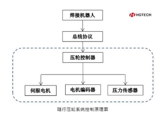隨行壓輪控制器下掛于焊接機(jī)器人,焊接機(jī)器人通過總線對(duì)電機(jī)控制器觸發(fā)指令,不同零件及不同焊縫段的壓力值均可在機(jī)器人焊接程序中設(shè)定。