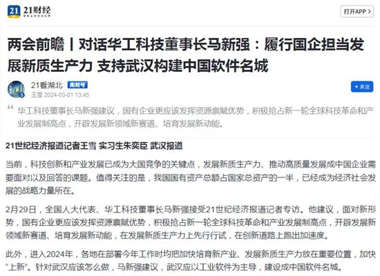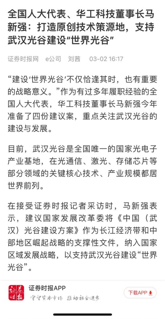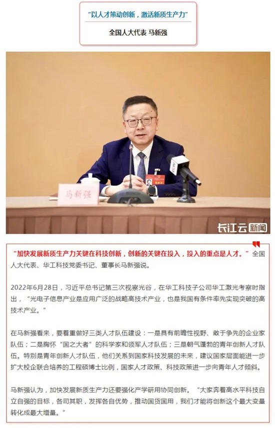 人民日?qǐng)?bào)、新華社、中央電視臺(tái)、經(jīng)濟(jì)日?qǐng)?bào)、科技日?qǐng)?bào)、新華網(wǎng)、工業(yè)和信息化部宣傳中心、人民郵電報(bào)、中國(guó)工業(yè)報(bào)、中國(guó)經(jīng)濟(jì)網(wǎng)、證券時(shí)報(bào)、證券日?qǐng)?bào)、上海證券報(bào)、21世紀(jì)經(jīng)濟(jì)報(bào)、經(jīng)濟(jì)觀察報(bào)、湖北日?qǐng)?bào)、極目新聞、長(zhǎng)江日?qǐng)?bào)等多家媒體關(guān)注馬新強(qiáng)代表的履職情況及華工科技創(chuàng)新發(fā)展。