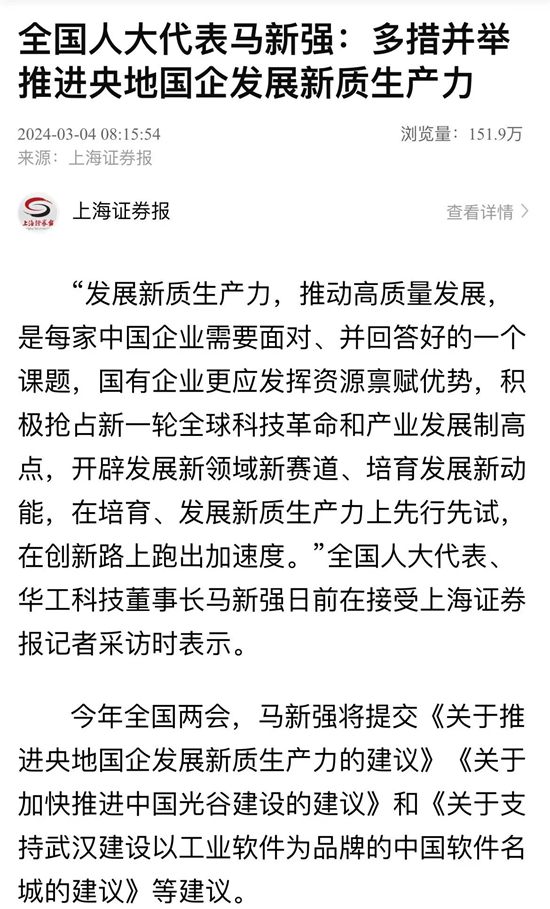 3月4日至11日,全國(guó)兩會(huì)在北京召開。十四屆全國(guó)人大二次會(huì)議期間,全國(guó)人大代表,華工科技黨委書記、董事長(zhǎng)馬新強(qiáng)提交了《關(guān)于加快推進(jìn)中國(guó)(武漢)光谷建設(shè)的建議》、《關(guān)于推進(jìn)央國(guó)企發(fā)展新質(zhì)生產(chǎn)力的建議》、《關(guān)于支持武漢建設(shè)以工業(yè)軟件為品牌的中國(guó)軟件名城的建議》等三項(xiàng)建議,涉及區(qū)域創(chuàng)新、新質(zhì)生產(chǎn)力等領(lǐng)域。