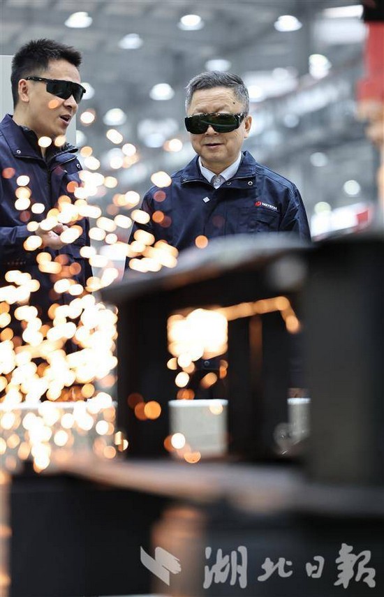 3月14日,陽春三月,春寒尚未完全褪去。在華工科技智能制造產業園葛店園區生產車間內,三維五軸激光切割機器臂正靈動揮舞。隨著一道道弧線劃過,鋼花四濺,仿佛一場科技與工業碰撞的絢麗煙火秀。華工科技董事長馬新強身著藍色工裝,專注地站在機器旁,眼神緊緊跟隨機器臂的每一次動作,不時與身旁的工程師低聲討論著算法優化。